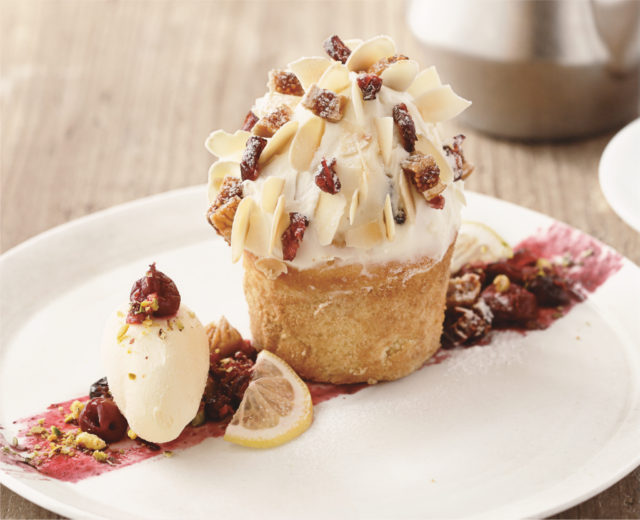 焼き菓子の定番マフィン。黒糖風味のしっとりマフィンの上にはクリームチーズクリーム、イチジク、クランベリーのドライフルーツ、アーモンドをトッピング。甘酸っぱいグリオットチェリーのコンポートとアイスでさらにマフィンの美味しさがアップ。