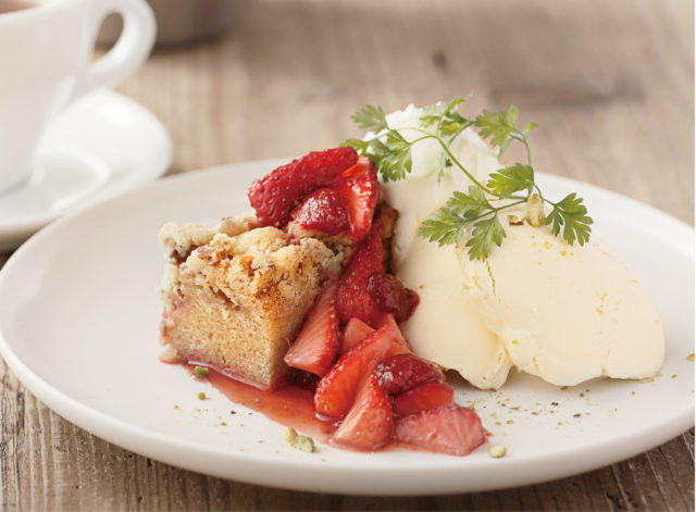シナモンの香りがふわっとサクサクのクランブルケーキにフレッシュのストロベリーを合わせ、濃厚なのにさっぱりとしたこだわりのミルククリーム、バニラアイスを添えた。