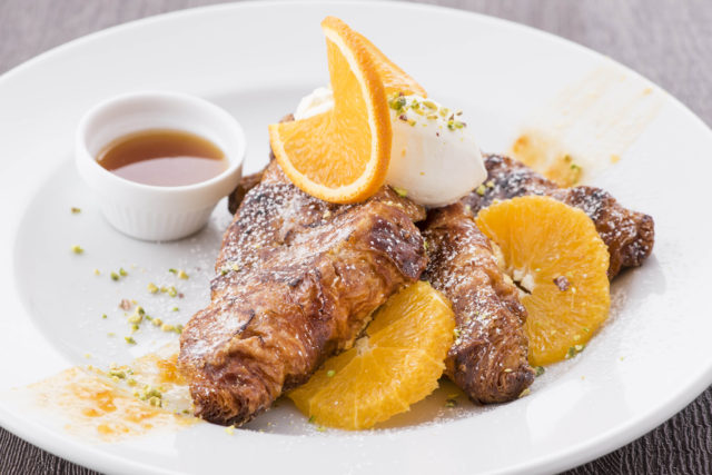 『オレンジクロワッサンフレンチトースト』は、オレンジピールを入れたアパレイユを染み込ませ、外側はさっくり、中はしっとりに焼き上げたクロワッサンのフレンチトースト。グランマニエで香りづけしたマスカルポーネホイップと、オレンジの果汁とメープルシロップを煮詰めたソースをたっぷりかけて、爽やかな風味を楽しめる。
