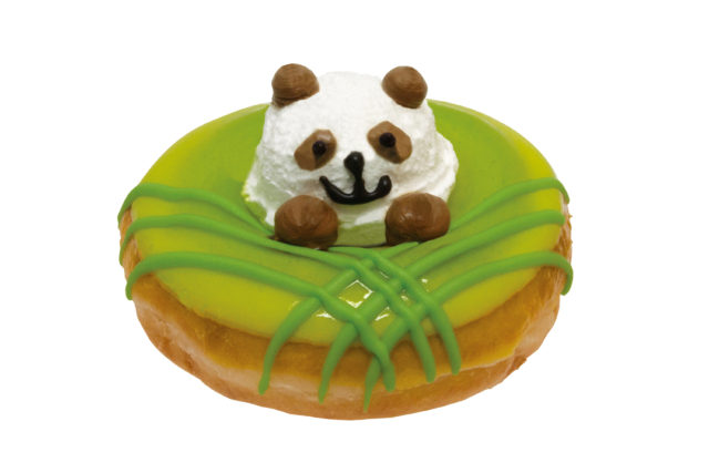 ふわふわのホイップクリームの上に、チョコレートで顔を描き、笹の葉に見立てたドーナツから飛び出す可愛らしいパンダを再現した。