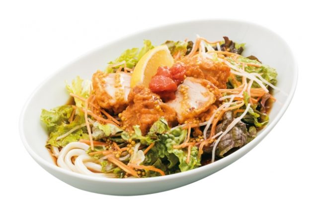 揚げたチキンに甘いソースの相性は抜群。ハニーマスタードのはちみつの甘さにフレッシュなレモンをかけた、今までにない新しいサラダうどんが誕生。