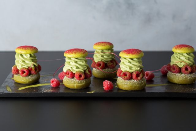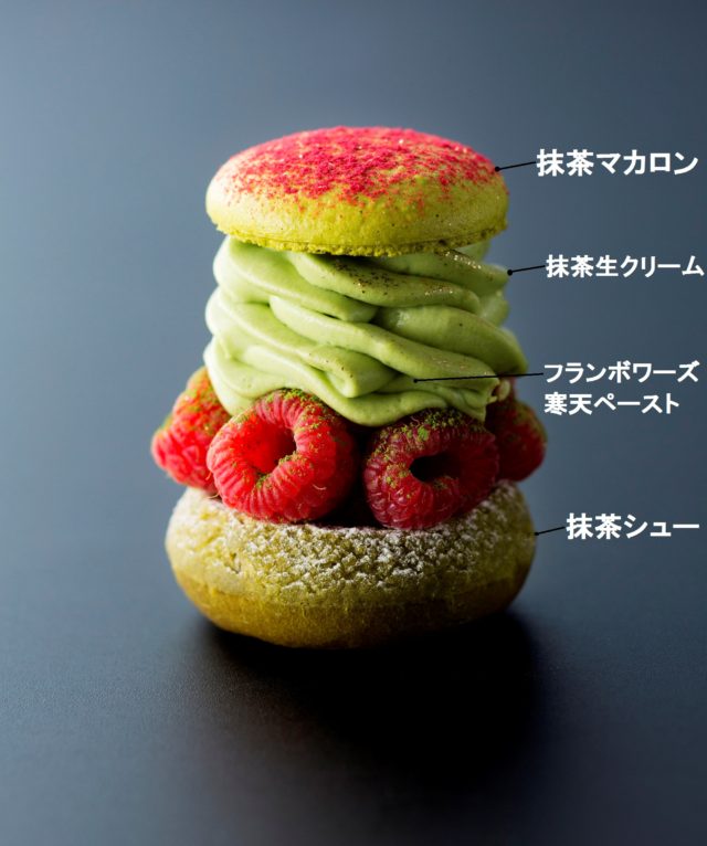 抹茶シューの上にフランボワーズの果実、フランボワーズ寒天ペースト、抹茶生クリームを乗せ、抹茶マカロンで蓋をした。抹茶のほろ苦さとフランボワーズの酸味、マカロンの甘さが三位一体となって口当たりの良いスイーツとなっている。赤と緑のコントラストなど、見た目の美しさにもこだわった。