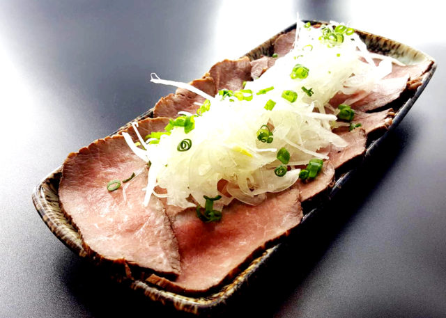 松阪牛のもも肉を使用したローストビーフは適度な霜降りでさっぱりと食べられるので赤ワインやビールなど贅沢なお酒のおつまみになる一品となっている。