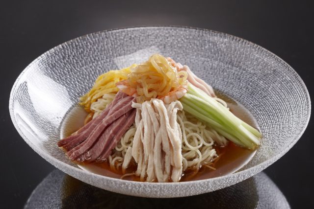 暑い夏の日にさっぱりと食べられる、醤油ベースの出汁を使ったシンプルな冷麺。焼豚、蒸し鶏、くらげ、海老、ハム、玉子、きゅうりをトッピング。