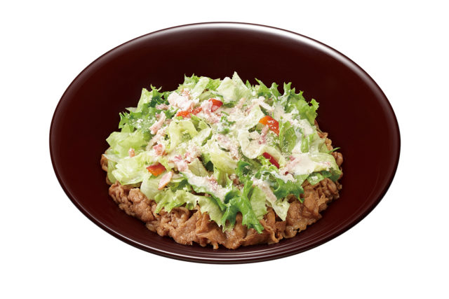 チーズの香りが食欲をそそる、見た目も華やかなすき家の「シーザーレタス牛丼」「シーザーレタスカレー」が楽しめる。