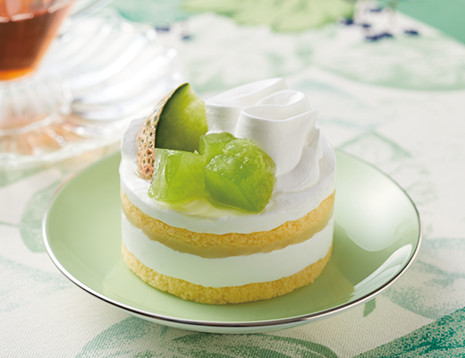 茨城県産のメロンをトッピングしたショートケーキ。ふんわりとしたスポンジでメロンソースをサンドし、北海道産生クリームを使ったブレンドクリームでデコレーションした。