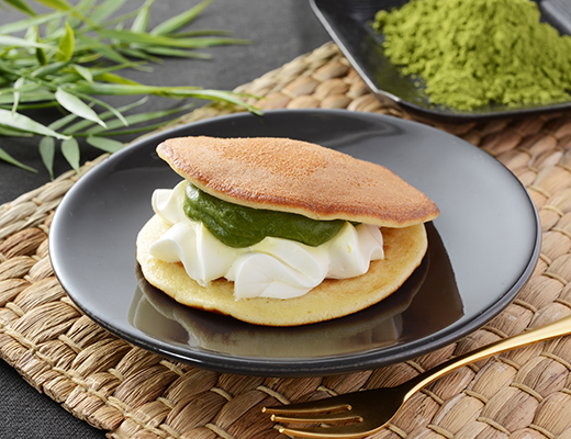 自家炊きカスタードに宇治抹茶ソース、ホイップクリームをブレンドした抹茶ペーストと、北海道産生クリームをブレンドしたミルククリームの2層仕立てになっている。もっちりしたどら焼生地でサンドした。