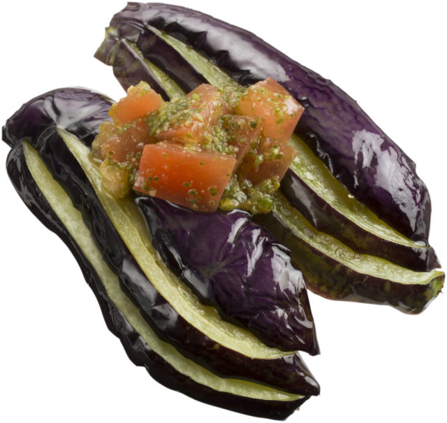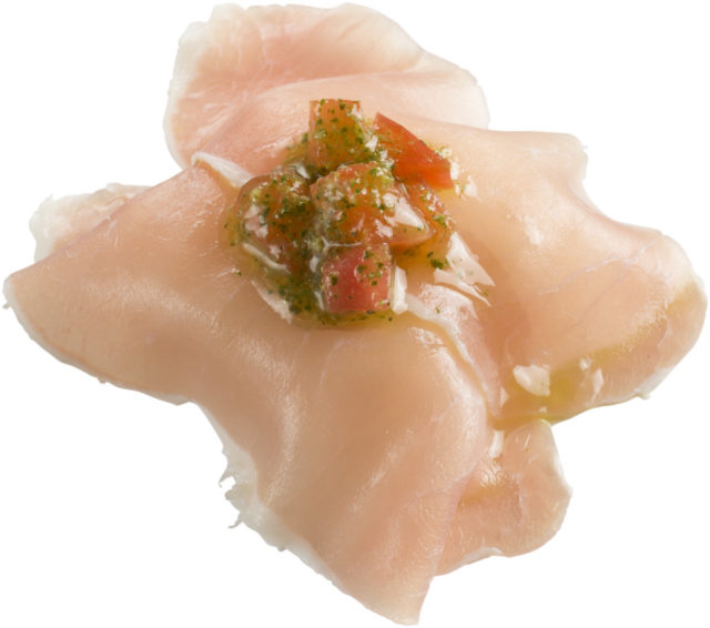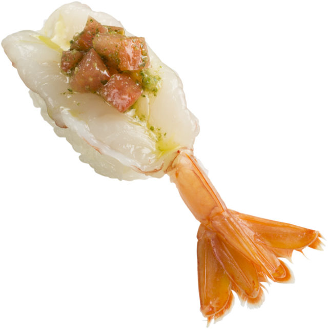 新鮮なネタの上に、夏野菜のフレッシュトマトと香り豊かなバジルソースを合わせてトッピングし、イタリアン風に仕上げている。