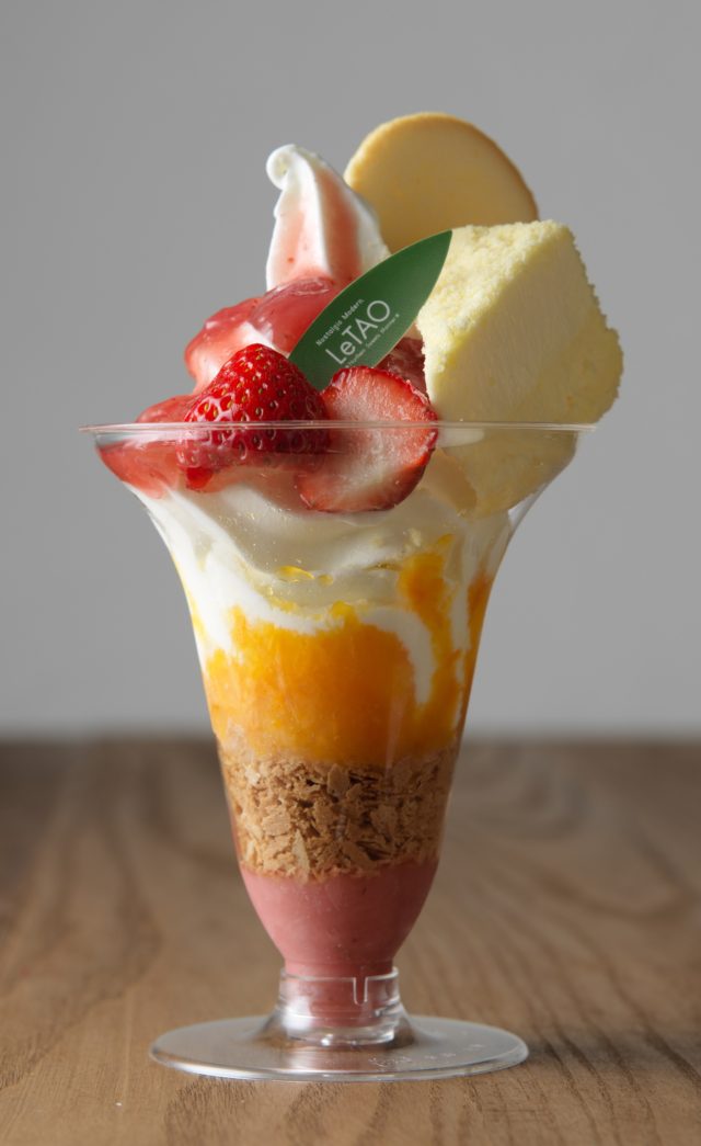 十勝ジャージーミルクソフトに、ルタオNO.1人気チーズケーキとチーズラングドシャを添え、さらに爽やかなみかんシーベリーソースと北海道産銀龍苺の果肉入りソースで仕上げた。フィアンティーヌの軽快なサクサク食感も楽しいルタオの”しめパフェ”となっている。