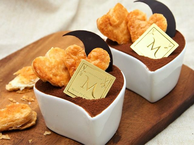 崩れやすく食べ辛い印象のミルフィーユが食べやすくも可愛らしいココットスイーツになって登場。ハート形のココットには、ヘーゼルナッツの焙煎から行った自家製ジャンドゥーヤムース、サクサクのパイ、オレンジ香るチョコレートクリーム、上にもさらにハートのパイとチョコレートで可愛らしく飾られている。