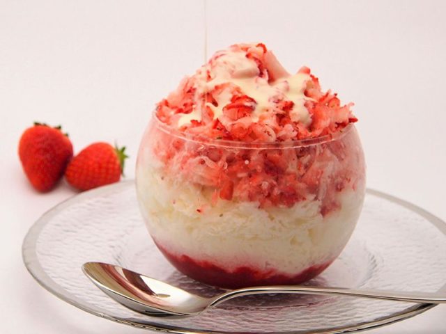 特製コンフィチュールと削り苺の甘み・酸味・香りが加わるとうっとりしてしまうほどの味わいを体験できる。付属の練乳ホワイトチョコソースを加えることにより、好みで濃厚さをプラスしながら楽しく食べられる。