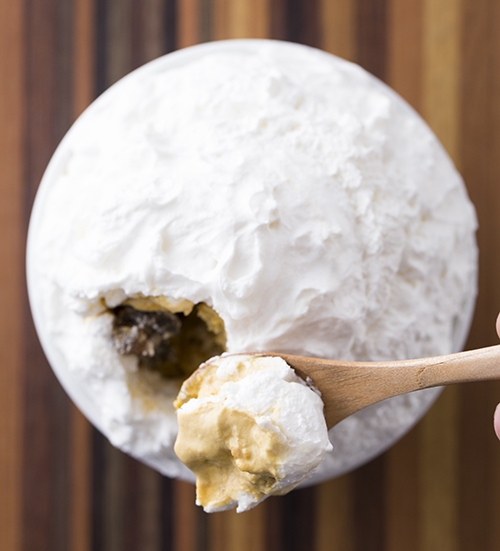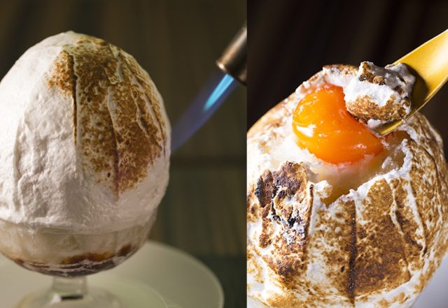 ・商品説明:たまごのカタチのかき氷をメレンゲで閉じ込めた。最後の仕上げに、目の前で炙って仕上げる。焼きたてのかき氷を提供。炙って香ばしいメレンゲとキャラメルソースは、かき氷をよりおいしく引き立ててくれる。