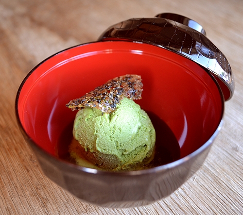 たまごの黄身にみたてた、濃厚卵黄ソースをツツイてとろ~り。かき氷に絡めて。