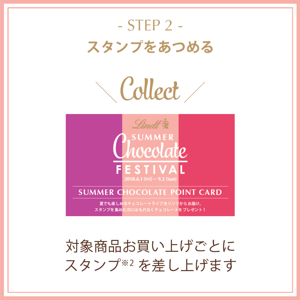 サマーフェスティバル期間中、リンツのお店にご来店いただき、対象商品(上記ショコラスイーツまたはチョコレート)をお求めいただくと、サマーチョコレートフェスティバルのポイントカードにスタンプを差し上げる。