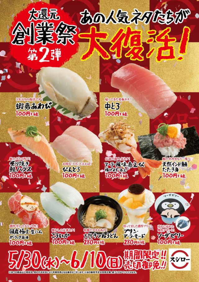 『スシロー創業祭・第2弾』では過去にスシローにて販売し、人気を博した商品を期間限定で販売する。