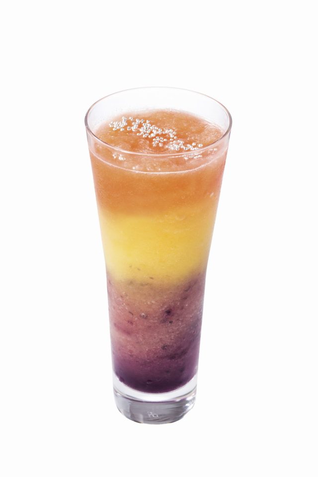 それぞれのグラスの下部には、織姫と彦星が出会うきっかけとなった紫色の羽衣をイメージしてピタヤ(ドラゴンフルーツ)のピューレを沈め、その上にマンゴーやパッションフルーツ、グアバ、パイナップルなどのトロピカルフルーツがミックスされたテイストのグラニータを注いだ。