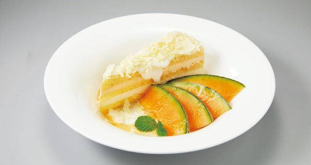 ホワイトチョコとメロンクリームの優しい甘みがひろがる、ふんわりソフトなショートケーキをフレッシュのメロンと共に味わう一皿。
