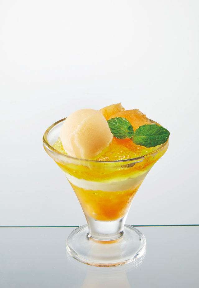 さらに、全体の味わいに変化をあたえるヴェルヴェーヌゼリーやマスカルポーネクリームなど、ひとつひとつの素材がメロンの美味しさを引き立てる。