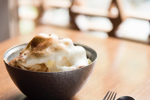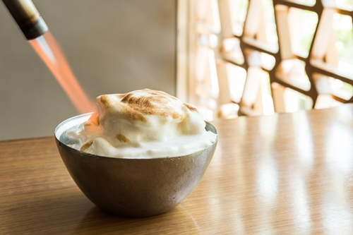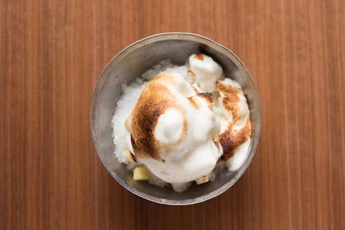 お客様の目の前でかき氷が炙られ、エスプーマへ徐々に焦げ目が付いていく様子は必見。林檎、粉糖、卵白を絶妙なバランスで混ぜ合わせてエスプーマにすることで、エスプーマ内の密度を上げ、氷に熱を通さずに表面だけが炙られる“炙りかき氷”を実現した。