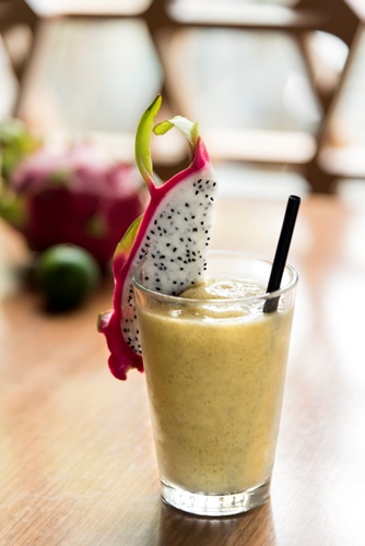皮膚の潤いを保つといわれるビタミンAやビタミンCが豊富な宮古島産マンゴーと、美容食とも呼ばれるスーパーフード、ピタヤ(ドラゴンフルーツ)を一緒にスムージーに。仕上げに徳島産のすだちを加えることで、濃厚かつ爽やかな酸味の余韻が楽しめる。