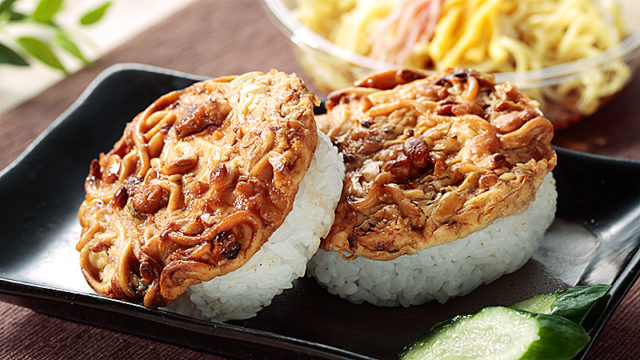 6月13日には、焼きそばがたっぷりと入った『モダン焼おにぎり』がお目見え。今回も、おにぎりの上に具材を堂々とのせている。キャベツ、焼そば、天かす、紅しょうがと、食感も楽しめる自家製のモダン焼にたっぷりのソースがつけてある。