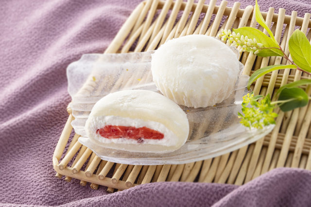 ・洋菓子で人気の杏仁豆腐と 甘酸っぱい苺ソースを組み合わせた甘さ控えめのクリームを、とろけるほどやわらかいもちで包んだ、洋風大福。