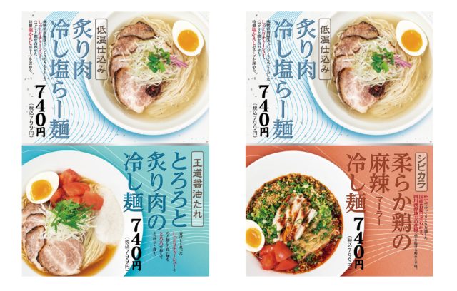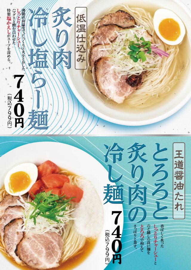 『低温仕込み 炙り肉冷し塩らー麺』『王道醤油たれ とろろと炙り肉の冷し麺』