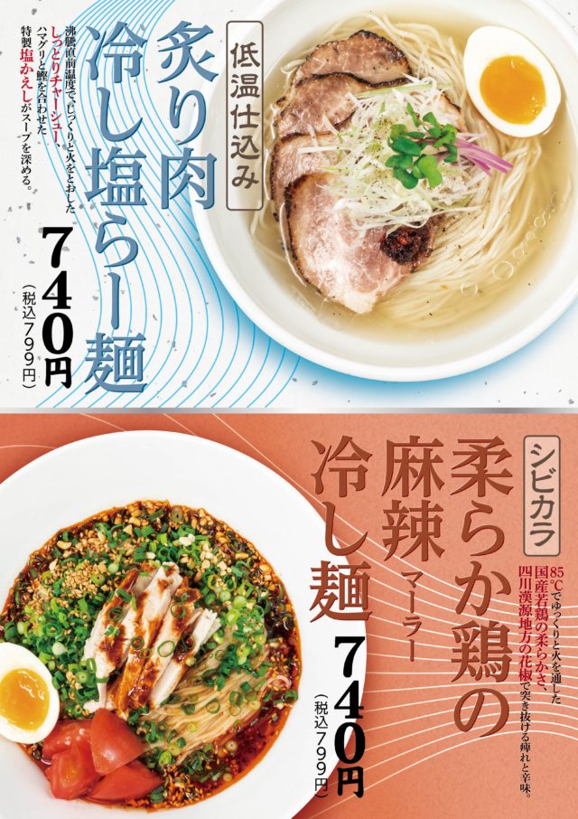 『低温仕込み 炙り肉冷し塩らー麺』『シビカラ 柔らか鶏の麻辣冷し麺』