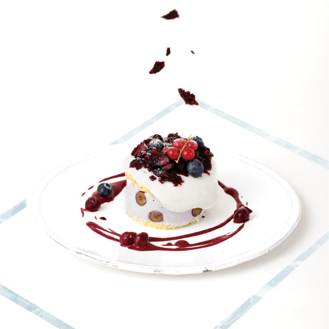 メレンゲにクリームとナッツを合わせ冷やし固めたヌガーグラッセ(フランスのアイスクリーム)は、ナッツのザクザクの食感が楽しいアクセントで口解けは軽やか。なめらかなフローズンブルーベリーにふわっとしたブルーベリーアイスを合わせた、新感覚デザートとなっている。