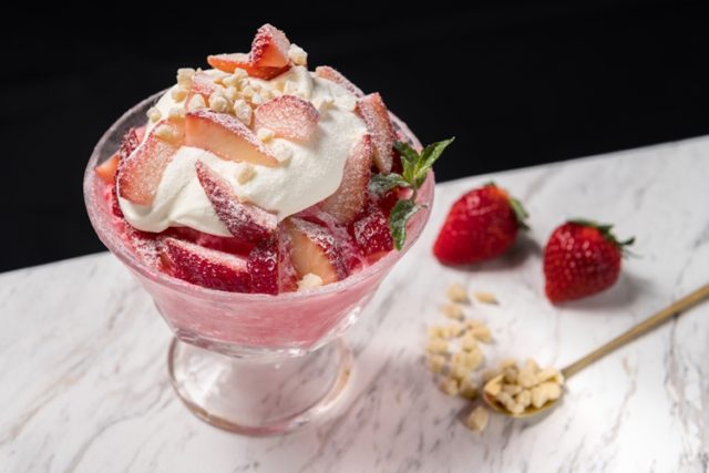 「ホワイトチョコレートストロベリーかき氷」は、ミルキーなイチゴアイスブロックを削り、ホワイトチョコレートホイップクリームとイチゴをたっぷりとのせたかき氷。ふわふわのストロベリーかき氷と優しい甘さとホワイトチョコレートの相性は抜群。