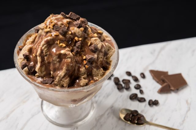 コーヒーの芳醇な香りを濃縮したコーヒーアイスブロックを削り、ミルクチョコレートをかけて、仕上げにミルクチョコチャンクやヘーゼルナッツビッツを散りばめた上品な甘さがくせになる大人のかき氷。