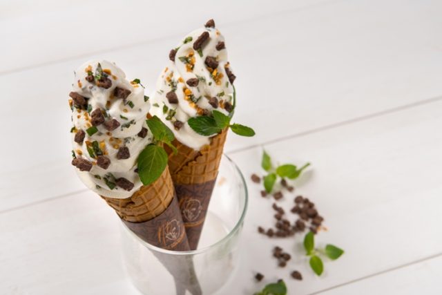 ミルクチョコチャンクやフレッシュミントがトッピングされた涼しげなソフトクリームを楽しめる。