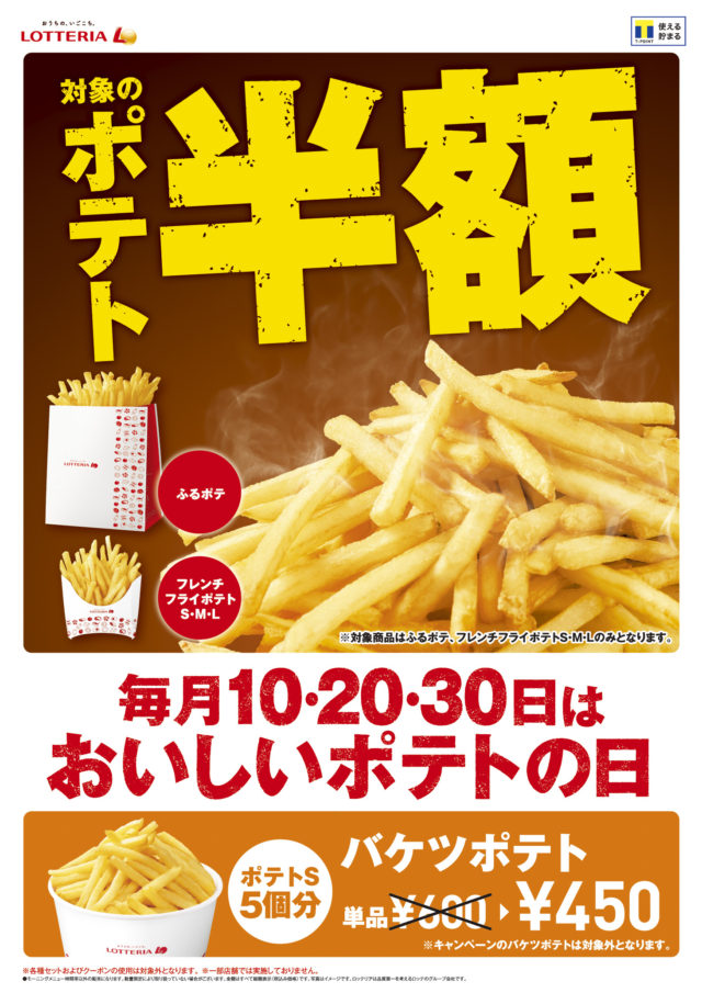 株式会社ロッテリアは、「ポテト半額」キャンペーンを2018年6月10日(日)、20日(水)、30日(土)の3日間、全国のロッテリア※1にて実施する。※1:一部店舗を除く。