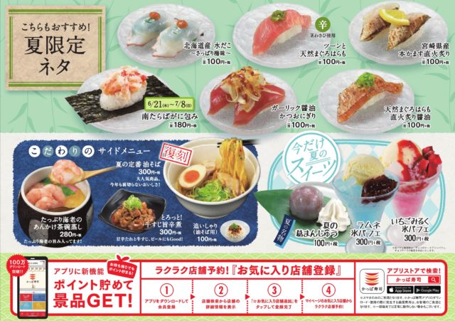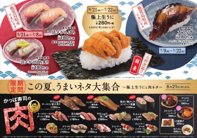 コロワイドグループのかっぱ寿司は、2018年6月21日(木)より、国産の生うにやバラエティ豊かな肉ネタを中心とした「この夏、うまいネタ大集合~極上生うにと肉ネタ~」を開催する。