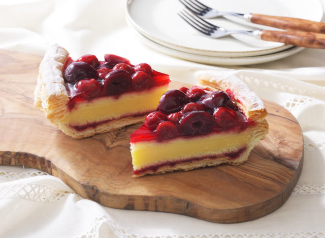 風味ゆたかなパイの上にまろやかカスタードを重ね、ほど良い酸味が魅力のサワーチェリーと、濃厚な味わいのスイートチェリーを贅沢に並べた。夏においしく食べられる、さっぱりとした味わいとなっている。