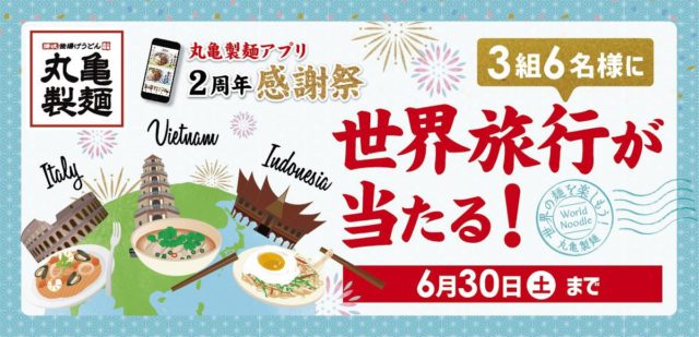 今回のキャンペーンは、丸亀製麺アプリ内の専用アンケートに回答をした人の中から抽選で、世界旅行(イタリア or ベトナム or インドネシア旅行 ※各国1組2名)に招待する。回答期限は、6月30日までとなっている。