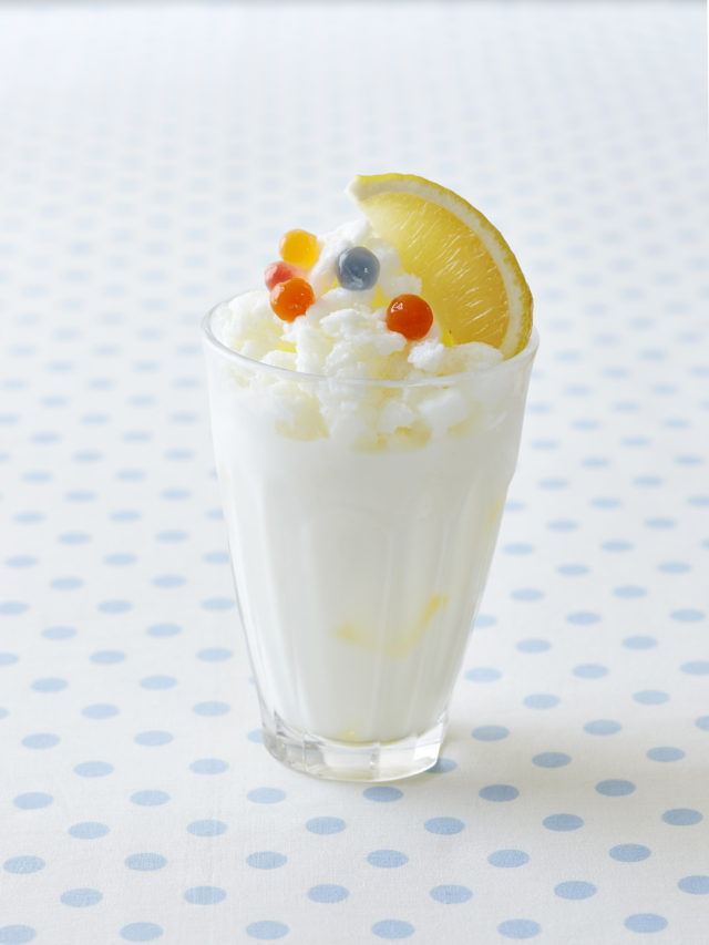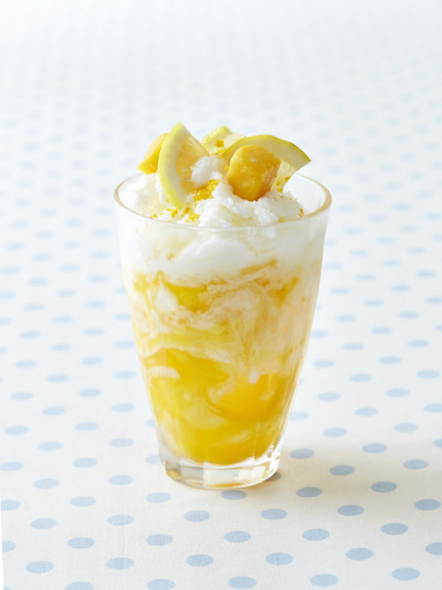 「カルピス」とヨーグルトで作ったラッシーに、「カルピス」のシャーベットをたっぷりのせたフローズンドリンク。レモンを絞ったり、マンゴーパッションソースと合わせて。