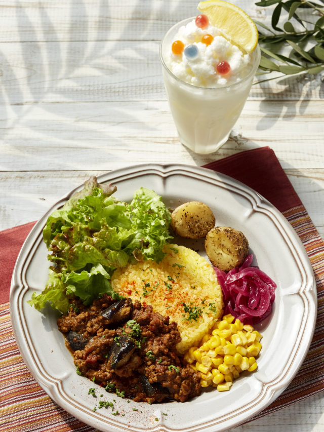 スパイシーなトマトベースのキーマカレーに揚げナスをトッピング。レモンバターコーン、「カルピス」を使ったレッドオニオンピクルス、ハーブソルトポテトを添えて。