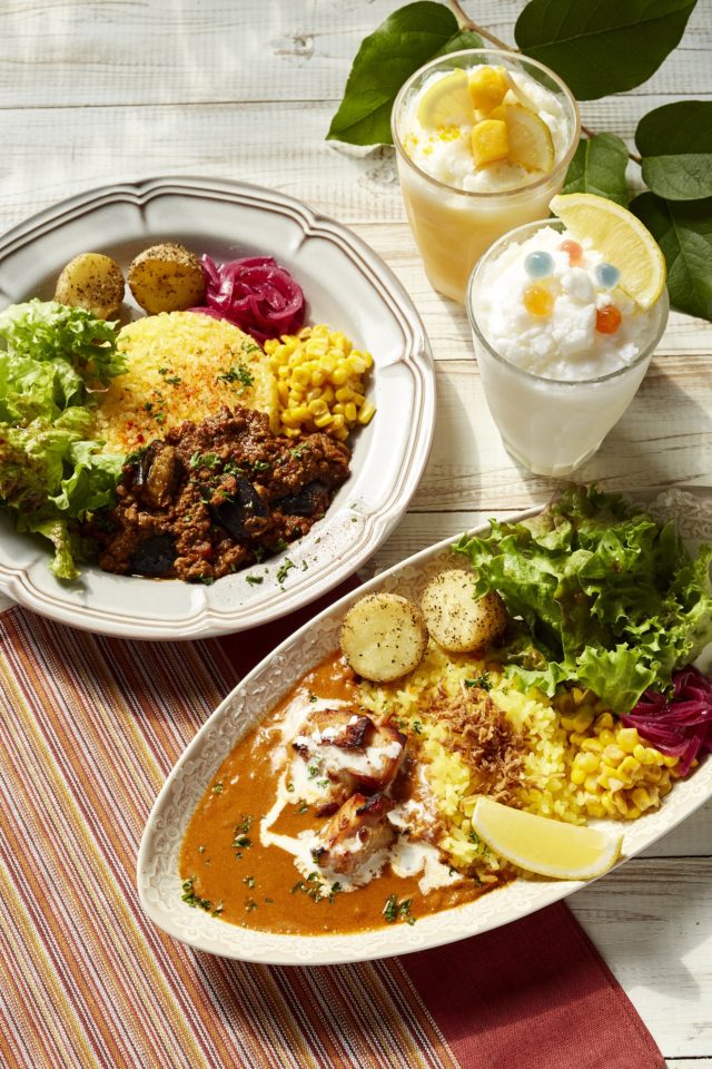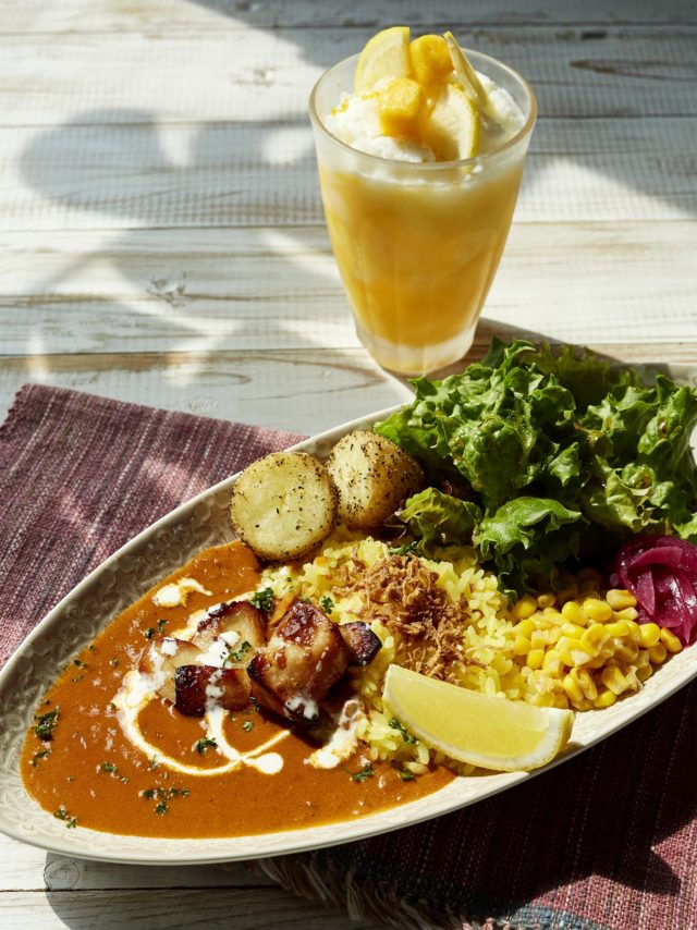 レモンのマーマレードを隠し味に、オリジナルスパイスミックスとアーモンドミルクを加え煮込んだクリーミーなカレー。レモンバターコーン、「カルピス」を使ったレッドオニオンピクルス、ハーブソルトポテトを添えて。
