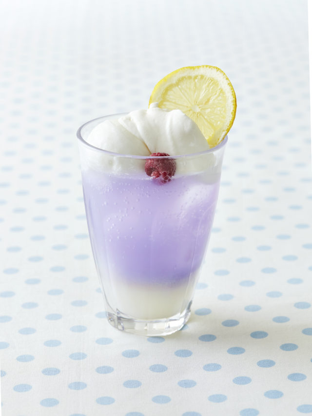 「カルピス」のソーダ割りにハーブ「バタフライピー」のティーシロップを合わせ、クリームチーズジェラート、ソルティチーズクリームをトッピング。