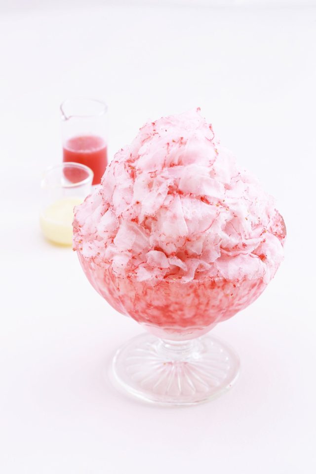 八戸産さちのかを凍らせて、そのまま削ってかき氷にした「果物屋の丸ごと苺のかき氷」。