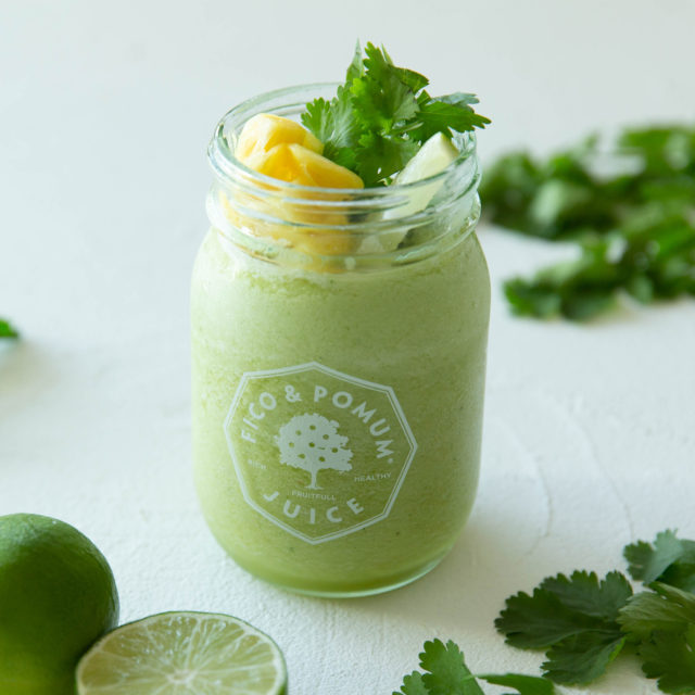 モヒートと言えばすっきりとした清涼感が特徴の、ラムを使った人気のカクテル。今回の限定商品では、モヒートをモチーフとした夏らしいカクテルスムージーに、栄養価の高いスパイスとしても使われる「パクチー」をプラスしたユニークなレシピを開発。「パクチー(=フレッシュコリアンダー)」を使ったスムージーは、スムージーの本場アメリカ西海岸でもコアな専門店を中心に親しまれていたが、フィコ&ポムムではそうした本格志向の本場の味を精巧に再現。国内でも急増するパクチストの期待に応える商品となっている。