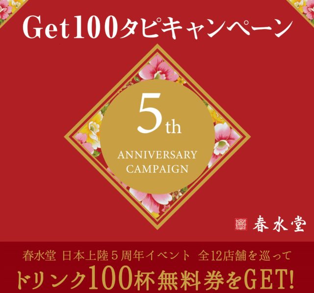内容  :春水堂日本上陸5周年を記念して、全12店舗に来店したお客へドリンク100杯無料券をプレゼント。