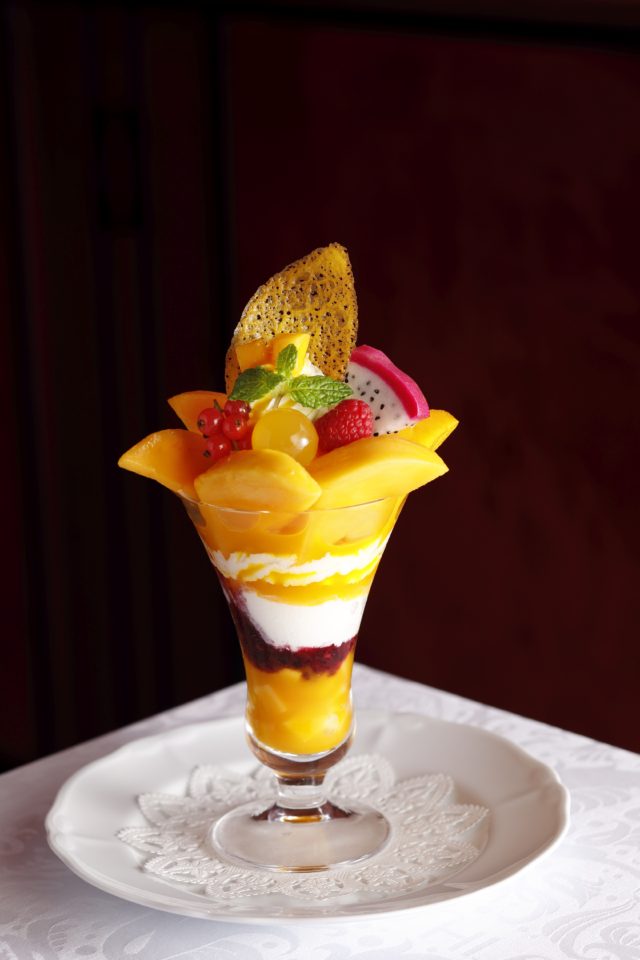 太陽の恵みをいっぱいに浴びて育った沖縄県西表島産アップルマンゴーをシャーベットやゼリーにも使ったデラックスな一品。色艶が良く、とろけるように柔らかい果肉は、上品な甘さの中にも程よい酸味と濃厚なコクが特徴。自家製ミルクアイスクリーム、ベリーソースがより一層の深みを与えている一品となっている。