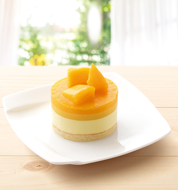 米粉、アーモンドプードル※2、豆乳などを使用して焼き上げたスポンジ生地の上に、カスタード風のムースとマンゴープリン、マンゴーソースを重ね、大きめにカットしたマンゴーを贅沢にのせた。トッピングのカットしたマンゴーは、酸味と甘さのバランスに優れたタイ産のマハチャノック種※3 を使用。マンゴープリンに、マンゴーソース、ジューシーな果肉と、マンゴーづくしのおいしさを十分に感じられる夏らしいスイーツとなっている。