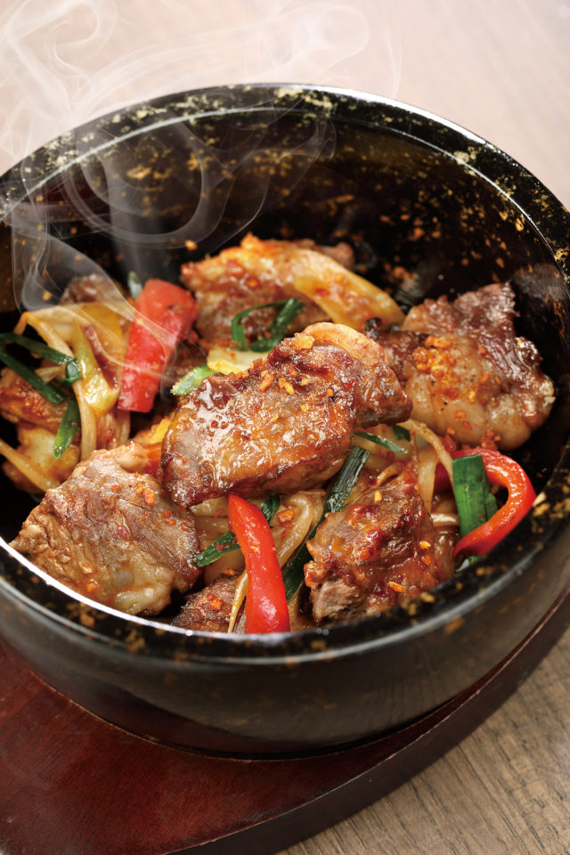 熱々の石焼きに牛カルビとナスやパプリカなど夏野菜を盛りつけた一品。一緒に提供されるタレを回しかけると「ジュー」という音とともにタレが肉や野菜にからまり、焼ける香りが食欲をそそる。カルビの肉質は柔らかく、脂の甘さを感じられピリ辛のタレとよく合う一品となっている。肉と野菜を一緒に食べるのがオススメの食べ方となっている。
