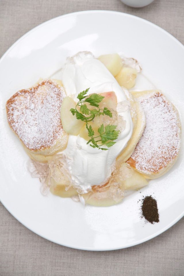 さらにアールグレイを砕きお皿に添えた。ふわふわのパンケーキと季節の白桃を3つの香りで楽しむことができる商品となっている。発売期間は、7月1日(日)から良質な国産白桃が入手可能な時期まで提供予定となっている。