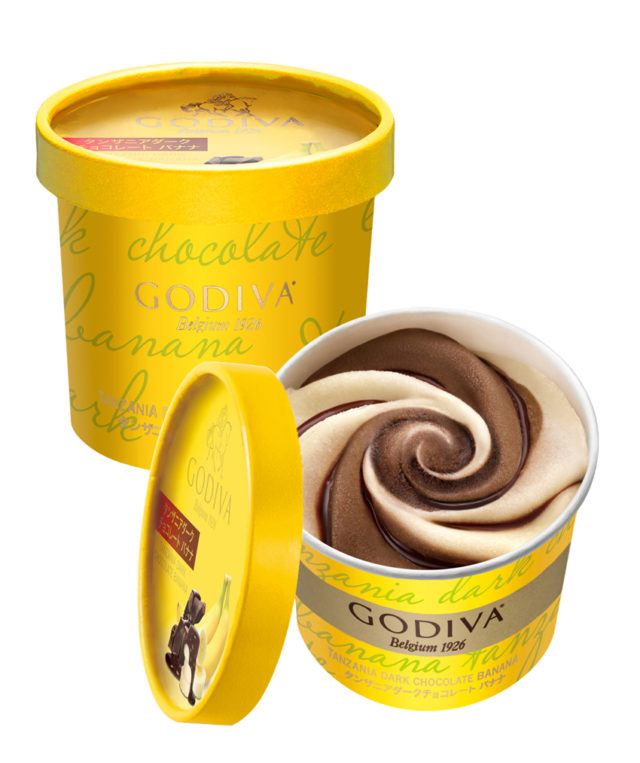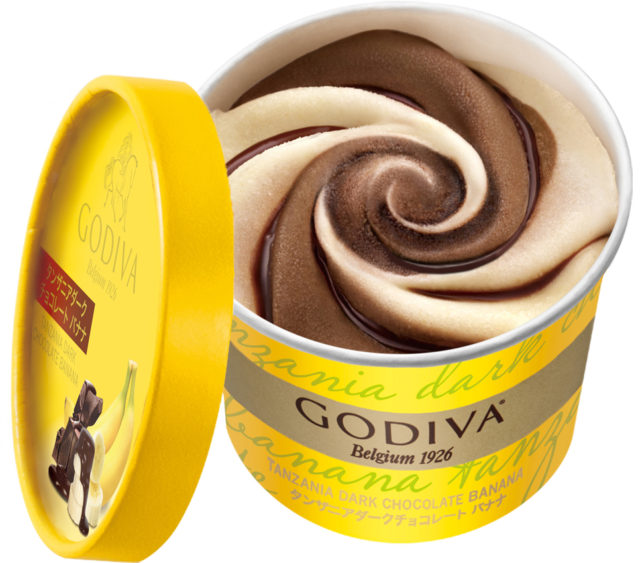新フレーバーの「タンザニアダークチョコレート バナナ」は、バナナピューレをたっぷり使用してバナナの味わいが口の中に広がるバナナアイスクリームに、ゴディバならではのタンザニアダークチョコレートアイスクリームとなめらかなチョコレートソースのハーモニーが楽しめる風味豊かなアイスクリームとなっている。