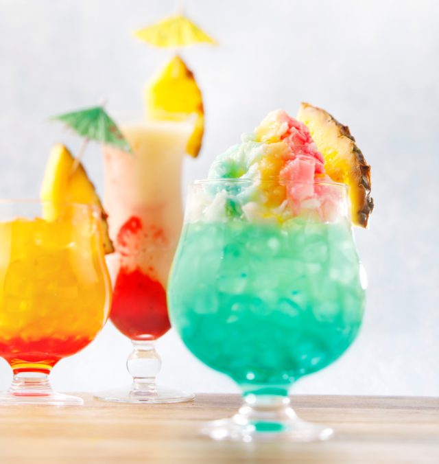 ハワイの青い海と白い雲にかかったレインボーをモチーフとした『ミルキーシェイブアイス』はパイナップルをベースにしたブルーハワイに、ふわふわのミルクシェイブアイス(ミルク風味のかき氷)がのった夏にぴったりのひんやりドリンク。※ノンアルコール。