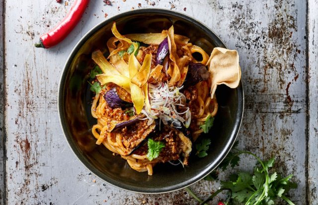 麻婆茄子とカレーをあわせた、ボリューム満点の一品。華やかな香りの花山椒が際立つ麻婆茄子と濃厚なバターカレーをあわせ、うどんにたっぷりと絡めながら食べる一品となっている。